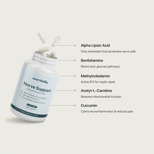 Neurobella contains 18 therapeutic ingredients at clinical doses. The most important are Alpha Lipoic Acid (600mg) which repairs nerve cells, Benfotiamine (300mg) which blocks toxic glucose pathways, and Methylcobalamin (2,500mcg) which rebuilds protective myelin sheaths.